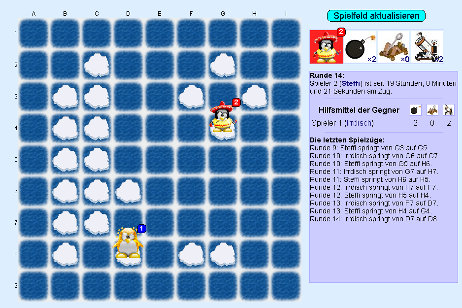 Spielkonzept: Zwei bis vier Spieler versuchen, sich abwechselnd bewegend auf einer schwindenden Eisfläche zu bleiben. Dabei stehen den Spielern in begrenzter Anzahl Hilfsmittel zur Verfügung, um das Spielgeschehen zu beeinflussen. Ist kein Zug mehr möglich, scheidet der betroffene Spieler aus. Gewonnen hat der letzte Spieler auf dem Feld.